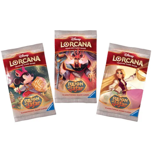 Każdy Booster (zestaw dodatkowy) zawiera 12 losowych kart kolekcjonerskich Disney Lorcana: Reign of Jafar (Set08):