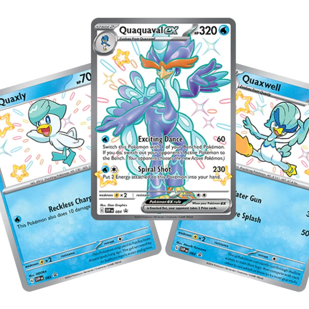 Zestaw kart promo Pokemon TCG Quaquaval ex (SVP 084), Quaxwell (SVP 083), Quaxly (SVP 082) - SV Black Star Promos z Paldean Fates Premium Collection Quaquaval ex